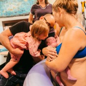 Our amazing doula, Terry, arrived at about 9:30 and our phenomenal midwife, Miriam, arrived about 11. Our nanny, Iryna, came to take our daughter, Basil, out to the park. I remember looking at the clock at 12:52 and asking my husband to text Iryna to tell her to bring Basil home for lunch and her nap. She text back right away and said they were on their way home. Just after I read the text, I had another strong contraction and i felt my water break. I said, “Oh! My water just broke!” and a few seconds later a big gush came. That was a really crazy feeling. We got some towels and headed downstairs to the birth tub. Contractions got extremely strong after that and as soon as i got into the tub I had my first urge to push. I fought those first 2 urges to push b/c it didn’t feel like I was open enough to get the baby out. I was a little scared. It was the most intense sensation i have ever felt. I know there was some cursing that came out of my mouth. I remember thinking that wasn’t a nice way for the baby to come into the world but i couldn’t help it. It was so intense. I turned over so i was more belly up in the tub and the urge to push felt better. I could feel the head coming down the birth canal and she started crowning. This burned a lot and i thought i was going to tear. I told this to Miriam and she helped me point out where it was burning. She put pressure in one spot and i tried to push myself around the head to help the process. the next push her head came out but since i could feel everything I said, “Her shoulders are stuck!” Miriam said they were not stuck and she did a little maneuver to guide one shoulder out at a time. (She told us later that if both shoulders come out at the same time, the mother usually tears pretty bad. I wonder if less people would tear if they had feeling down there so they could tell the dr./nurse what they are feeling. She also said the cord was also wrapped around her neck and she unwrapped it but since she is such an amazing midwife, i had no idea she did any of that.) She was born at 1:31pm. I was SHOCKED we had another daughter. Happy but surprised. I couldn’t stop smiling b/c labor had been so much easier and shorter and we had another healthy, beautiful daughter! It was awesome to see Basil meet her new sister.