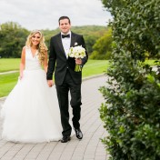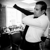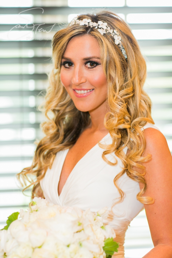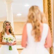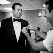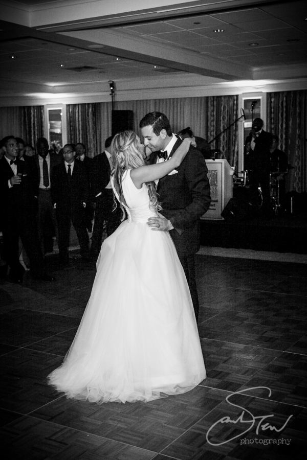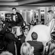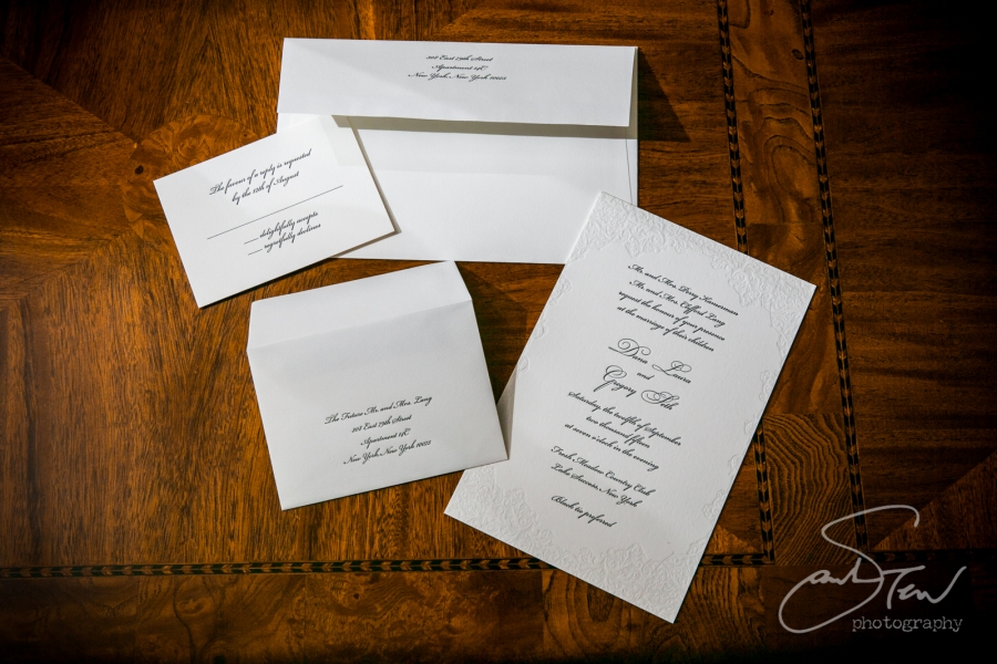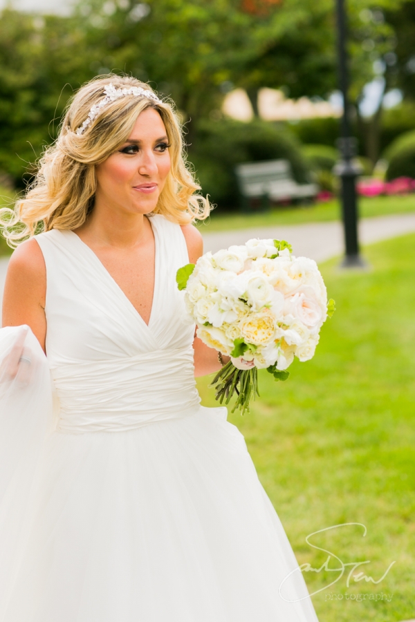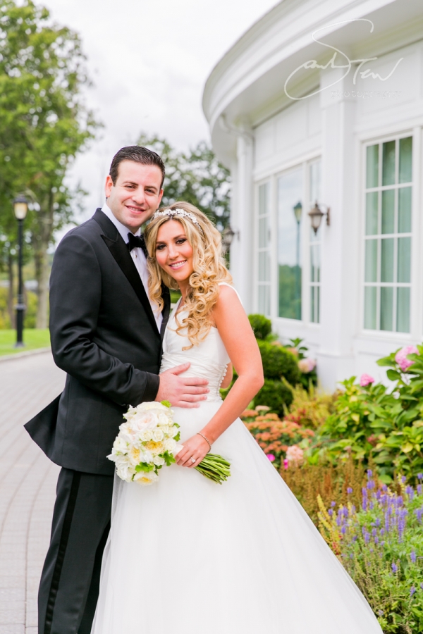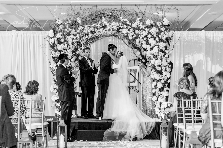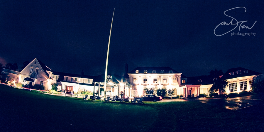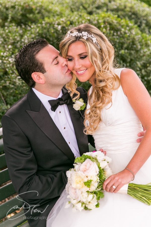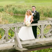 Greg & Dana were wed at Fresh Meadow Country Club on Long Island in September. Dana wore a gorgeous gown by Carolina Herrera– it was perfect on her and Greg’s face full of delight at the first look was so fun to capture. The forecast was for rain and we weren’t sure what time it would start, but we lucked out and got just enough time to do the couple’s portraits together outside before it started to rain. We even got to hop on some golf carts and head down to this pretty spot with a bridge over a little pond for some other scenic pictures out in the grounds. Once back inside we shot the family portraits in front of a lovely floral Chuppah prepared by Bride & Blossom, and then the couple went upstairs to sign their Ketubah with the Rabbi while guests arrived and took their seats in the ceremony room downstairs. After their beautiful ceremony, guests enjoyed a multi-room cocktail hour with amazing food (there was even a sushi bar!) and specialty cocktails. Meanwhile the staff at Fresh Meadow expertly transformed the ceremony room into a reception area complete with a dance floor. I had my photobooth ready to go for the evening and Greg & Dana’s friends and family made wonderful use of it all night long. Highlights of the reception included some very sweet and amusing toasts from parents and siblings, and I must say I was particularly impressed with the band- they were amazing and I’ve never seen an electric violinist perform with such gusto! Towards the end of the evening I took the happy couple outside (it had stopped raining) to do a night portrait of them– this time we made a heart painted with light over a long exposure. Check out my favorite shots from this beautiful wedding and congratulations to Greg & Dana!