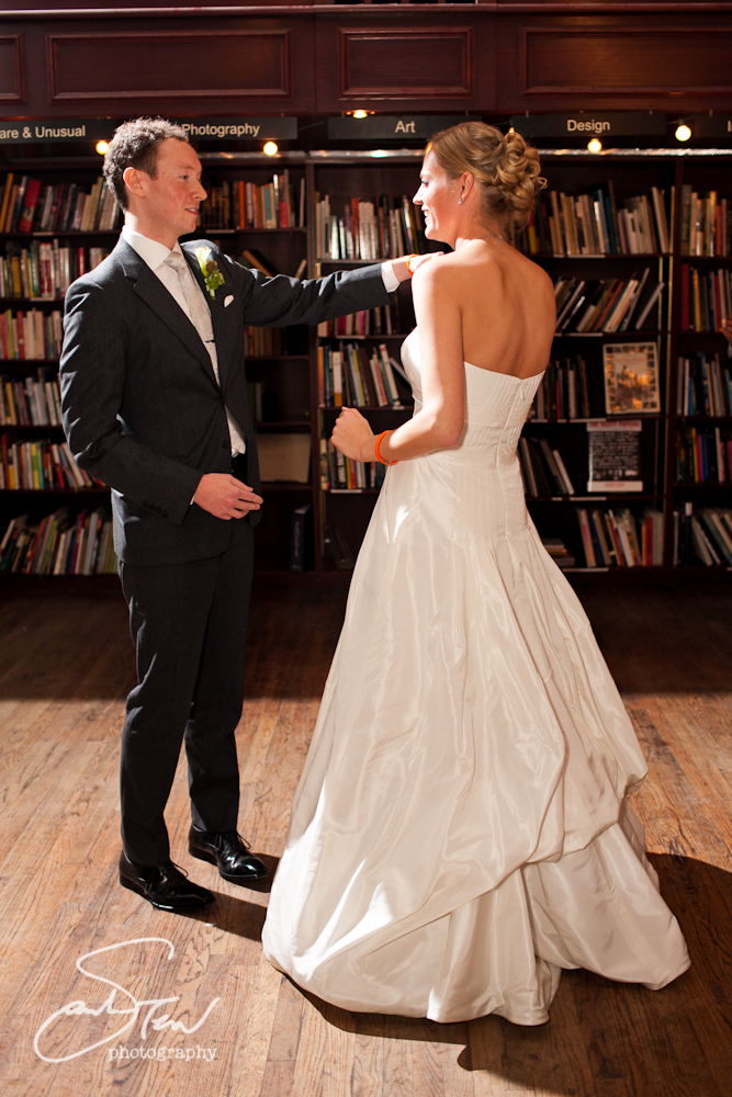 Kate & Charley have been together since they were students at Carleton College, and they are one of those couples that just seem totally relaxed together and you can just tell that they have each other’s back no matter what, it’s such a good fit. My suspicions about how great they are together were confirmed by the toasts we heard at their wedding last weekend, at Housing Works Bookstore . They wanted to have a mid-size yet intimate wedding with friends and family in attendance, many of whom came from the midwest for the occasion, and so a double-decker sightseeing bus was arranged to shuttle guests for a quick tour on the way from Blessed Sacrament, on the Upper West Side, down to the reception in Soho. My assistant photographer Zack rode the double decker while I rode the partybus downtown with the wedding party, snapping some shots as we went. By the time we made it through some tough traffic down to the bookstore it was fairly dark outside so I made some nice portraits of them upstairs amid the bookshelves, and got onto the fun business of capturing the details for their reception. What a beautiful job Michael Day did on the on this wedding– I feel so lucky to work with such talented vendors on weddings like this– his florals were perfect dressing for the long dinner tables. Event planning was handled beautifully by Amanda O’Callaghan of The Works Catering. During cocktail hour we were treated to the wonderful and romantic musical stylings of Lapis Luna… I can’t say enough good things about this band, they sounded fantastic and chose some really great covers– just really great tunes to appeal to young and old guests. Their music combined with the low lighting and candles provided the perfect atmosphere for cocktails and dinner… after which a more danceable playlist got turned up loud as folks migrated to the dancefloor! I was able to steal Kate and Charley outside for a quick night portrait towards the end of the evening… if I hadn’t needed to take my equipment back to studio I would have been tempted to join this crowd at their well-publicized after party– check out the admission bracelets that they had out for guests to get into the club– such an awesome idea, and I bet it was a great party. Congratulations, Kate & Charley, your wedding was fabulous!