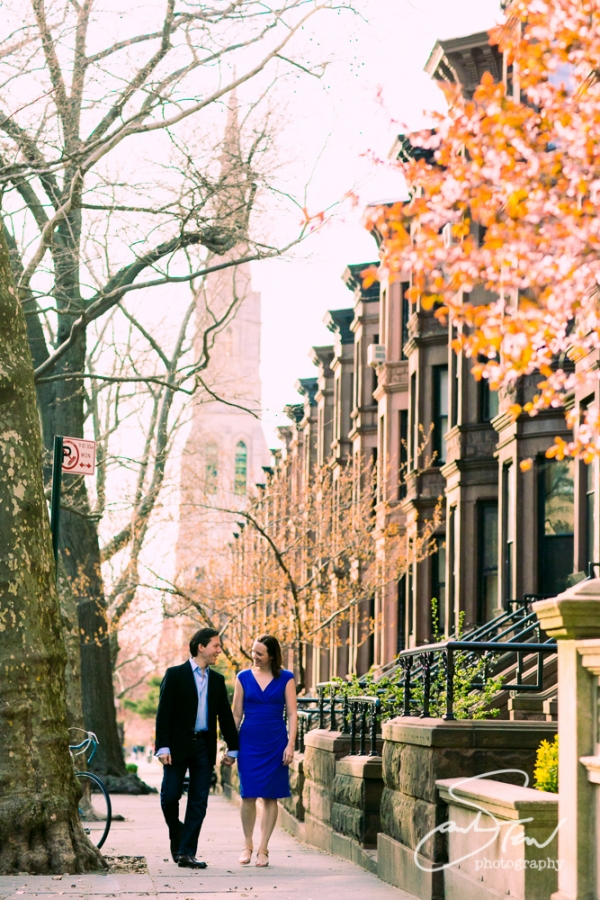 Laura & Axuve were guests at Amy & Andrew’s sweet wedding a few years ago and remembered loving a photo I took of them during the reception… cut to a few years later and they’re engaged! I was so honored by this booking– they were so sure they wanted me that they asked me for availability before even booking their date at the venue, which really blew me away! I knew they’d be super fun to shoot with and our session proved it so– since they are proud parents of some happy growing kitty-cats and didnt’ have any family pictures of the 4 of them together we started the session at their apartment in Park Slope… it was so funny trying to get these little balls of energy calm enough to sit still for a portrait and they were super curious about my camera–we ended up getting some great action shots of them playing too. After changing into their walk-around outfits we stepped outside and made our way to Prospect Park for some shots there, stopping along the way as we walked down pretty treelined streets full of brownstones. To finish the session they wanted to get the Brooklyn Bridge in a few shots so we hopped in a car to Dumbo and made it just as the sun was going down and the lights were coming on in manhattan– even though it wasn’t one of those gorgeous sunsets we always hope for as photographers I love the results with the pretty twinkling lights on the bridge…check out my favorites from the session! I can’t wait for their wedding at The Hammond Museum in June!