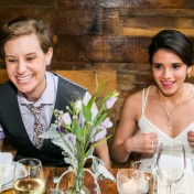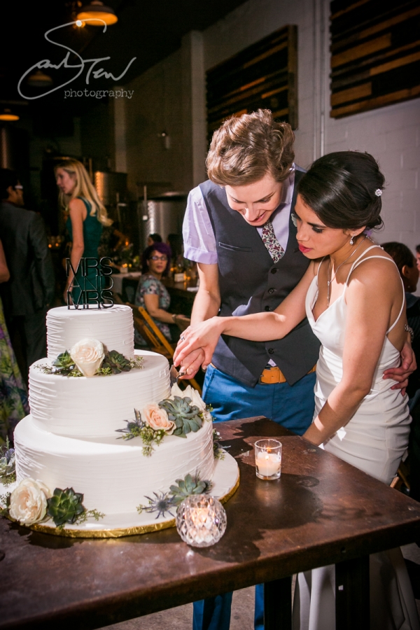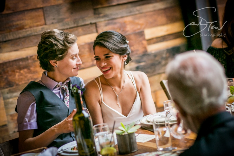 Lindsay & Courtnie were married at Brooklyn Winery in Williamsburg, Brooklyn. We started the day with them getting ready at the amazing Wythe Hotel. I arrived early to scout for some good portraits spots between the hotel and the venue and found several wonderful murals and spots I knew would photograph beautifully– check out their portraits below! After getting all dressed up in their finery for the big day we headed over towards the venue and met up with family members for some group pictures in the space before the guests started arriving. Lindsay & Courtnie’s ceremony in the beautiful rustic wood-walled main room of Brooklyn Winery was very moving– their vows were so personal and sweet, there was not a dry eye in the house! Guests enjoyed cocktail hour in the entry room with the bar and hit the photobooth upstairs (with a view of the ‘barrel room’) while the wonderful staff at Brooklyn Winery expertly transformed the ceremony space into a dining room complete with gorgeous long banquet tables. Activity books and “cootie catchers” with trivia about the couple provided a fun complement to the rustic industrial romance of the decor. After dinner everyone enjoyed dancing the rest of the night away– Lindsay & Courtnie were no exception! Toward the end of the night we set up a quick night portrait for them with a long exposure rainbow lighting effect I’d been toying with lately- I love how it turned out! I was so honored to shoot this special day for them– congratulations, Lindsay & Courtnie!