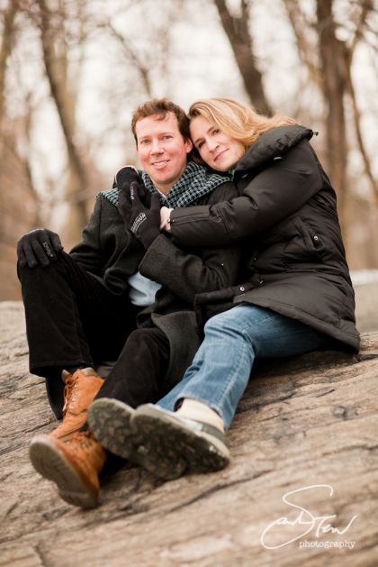 It’s rare that I do an e-session during the winter months, period. AND it’s rare that I shoot with such fun-loving people– Liz and Doug were totally awesome to work with and seemed to enjoy themselves despite the fact that they weren’t wearing hats in 24 degree weather. My engagement portrait shoots are usually around 90 minutes but because we got a hankering for shots with the ice-skating rink in the background we walked an extra 15 minutes or so down to the bottom of Central Park and poor Liz was probably numb with cold. I myself was pretty cold, having to wear fingerless gloves to use my cameras easily– but the hat, I fear, I could *not* have done without. Congratulations to Liz and Doug– they got some great shots and will be married in a month! Look for a wedding post on them in late february. They’re getting married at Central Park Boathouse on 2/20 and I can’t wait to shoot them again! Here are a handful of my favorites from the shoot.