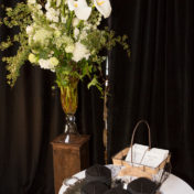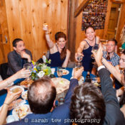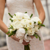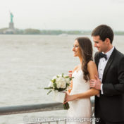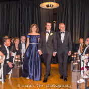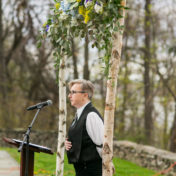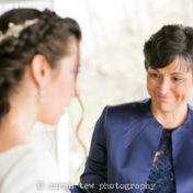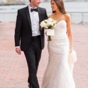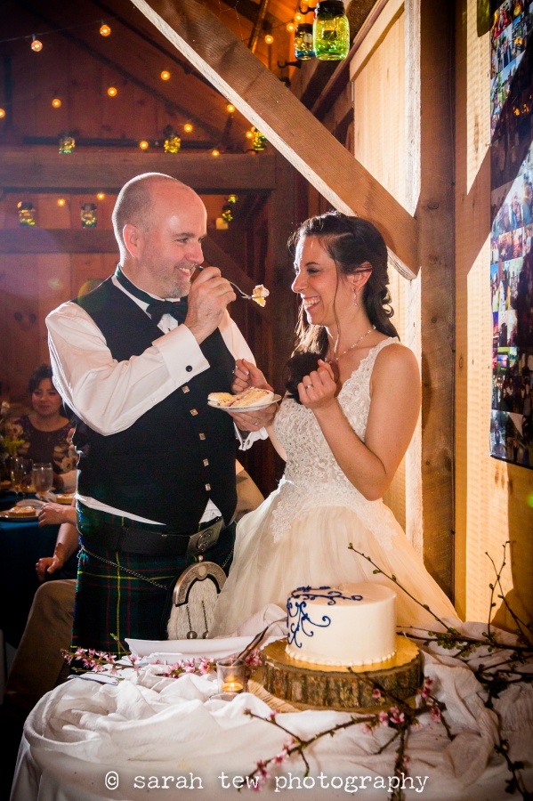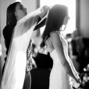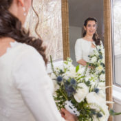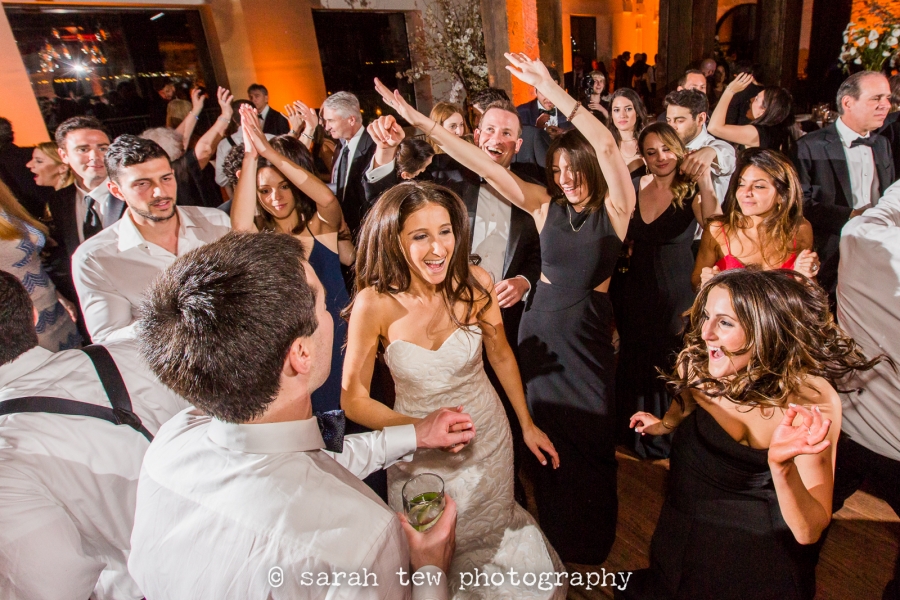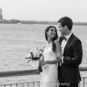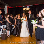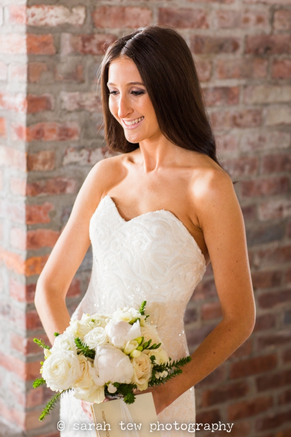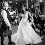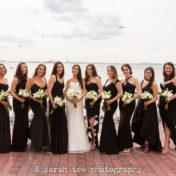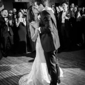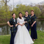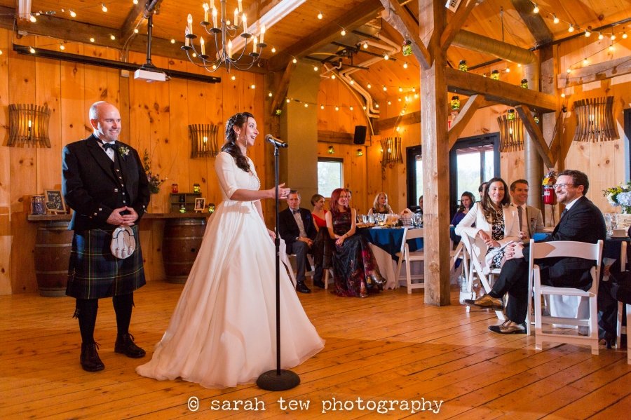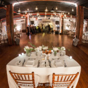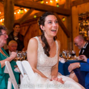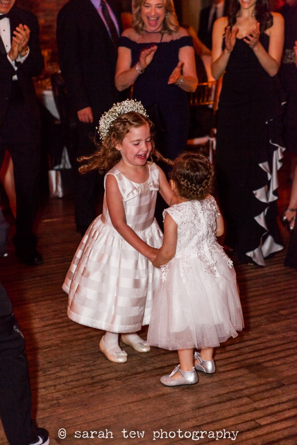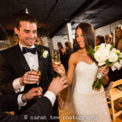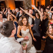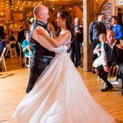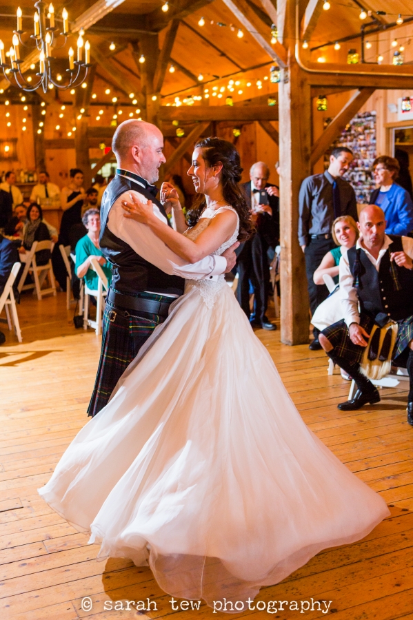 Erin & Scott planned their wonderful wedding at The Roundhouse at Beacon Falls, one of my favorite venues, what with it’s amazing waterfall, lovely windows and unique rustic industrial charm. I shot Erin’s getting ready in the beautiful bridal suites upstairs over the Roundhouse’s restuarant overlooking the falls. They have an adorable baby daughter, Abigail, whom I got to shoot with them at their engagement session, so I couldn’t wait to see them all together in their wedding finery. The floral dress she wore was simply perfect with the bouquets, which featured some of the most beautiful blooms I’ve seen. We planned the first look with Scott to be downstairs in the lovely bar/lounge area, complete with a fireplace. The nice thing about knowing it’s going to rain for sure is that we can prepare for it, so in that way we were quite lucky– none of the “will it or wont’ it?” and “should we try the ceremony outside and risk it” type worries that can create anxiety for a couple on their wedding day… and of course knowing the situation was indoors-only enables me to focus on making the best portraits I can in the spaces available. After a quick round of sweet couple-only portraits there in the bar we all headed up to the main space for wedding party and family pictures. Luckily for us, the Roundhouse is stunning and you can still get the beauty of the nature outside in the background of some indoor photographs there, thanks to the amazing floor to ceiling windows overlooking the water and trees just outside. Lighting a backlit wide group shot with windows in the background does pose it’s own challenge, reflection-wise, surely, but I think we nailed it with 2 gridded flashes on stands from 45 degrees on either side, and the wedding party and family groups were patient as we tweaked people’s positions to avoid unwanted shadows as much as possible, and I was happy with the resulting images. I took Erin and Scott out down by the waterfall for a few quick pictures under my big clear umbrella, it then it was on to the ceremony! Once again, the rain plan at The Roundhouse does not disappoint– the ceremony indoors is just as beautiful as it is when it’s outdoors there, and we all enjoyed Erin and Scott’s wonderful officiant’s account of their love story. Guests were treated to a cocktail hour upstairs while the staff transformed the main space for the reception party, and the evening was off to a great start. Over the next few hours we captured some very sweet and funny toasts, some spirited dancing (especially the “ring security” team– note their metal-detector wands, walkie talkies, sunglasses, and secret-service-like earpieces! SO CUTE!), and at the end of the night I was able to take the happy couple outside for a shot under the umbrella with the rain. Congratulations to Erin & Scott! It was such an absolute pleasure being your photographer!