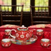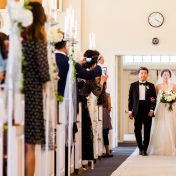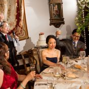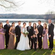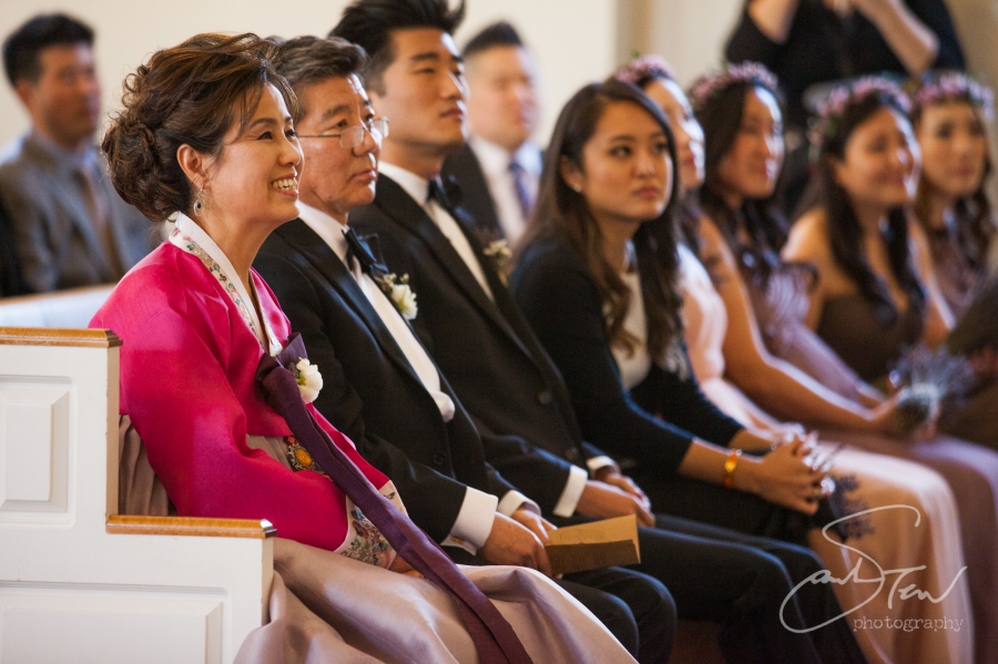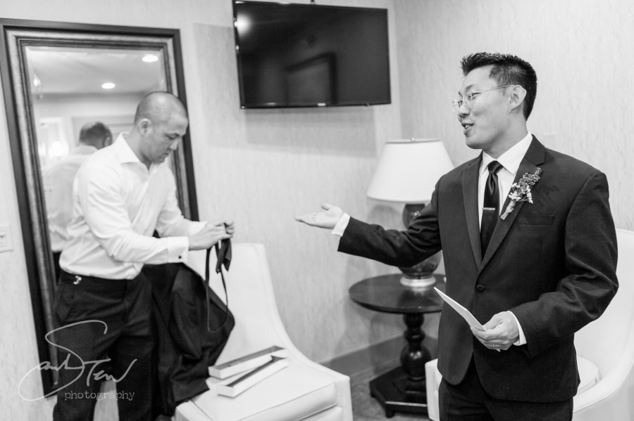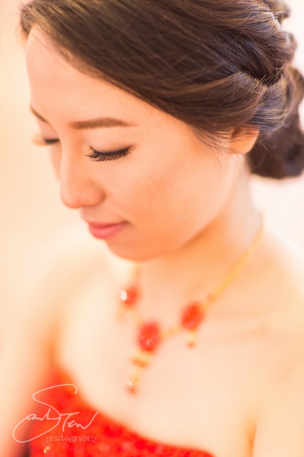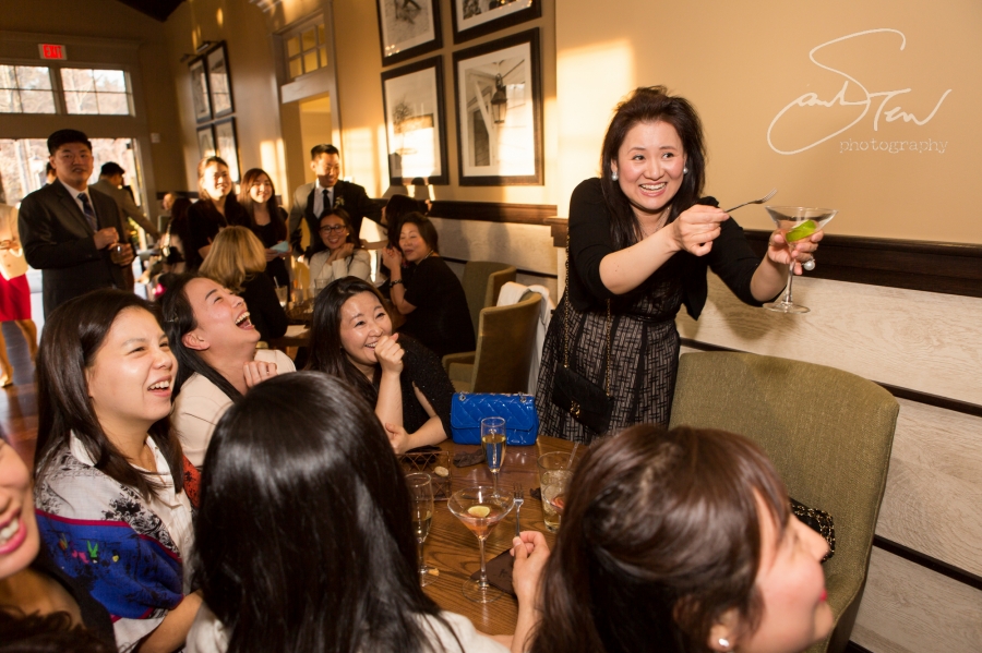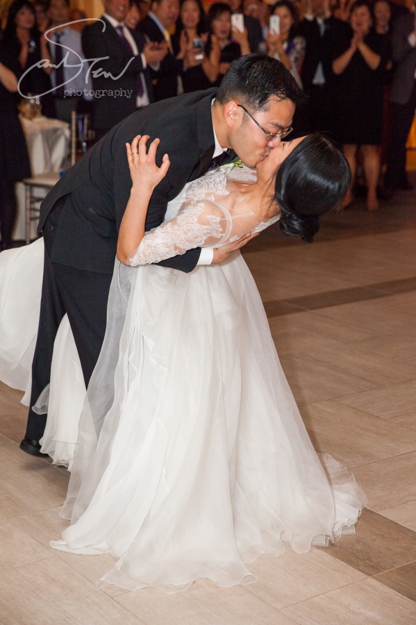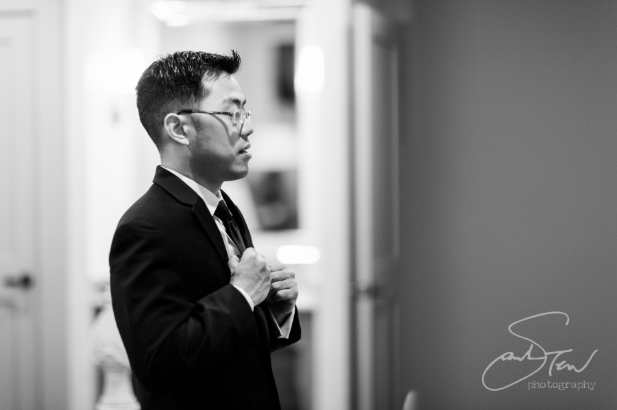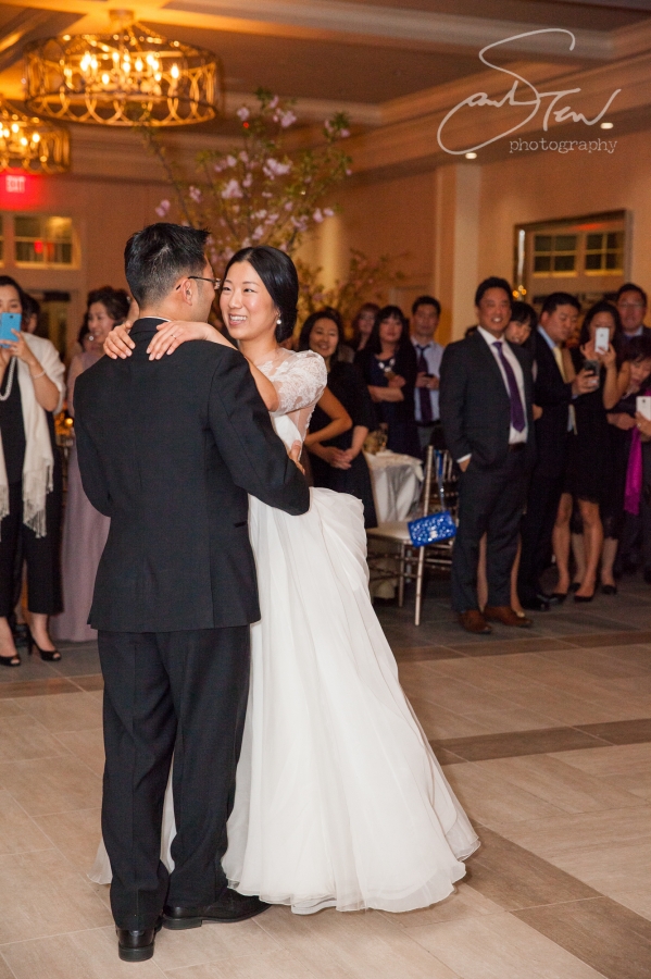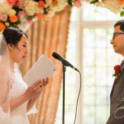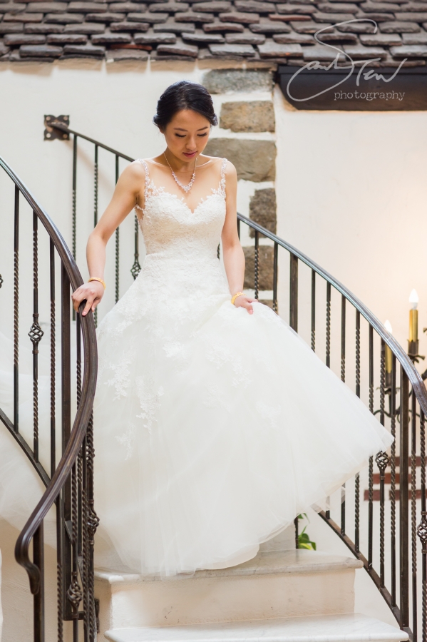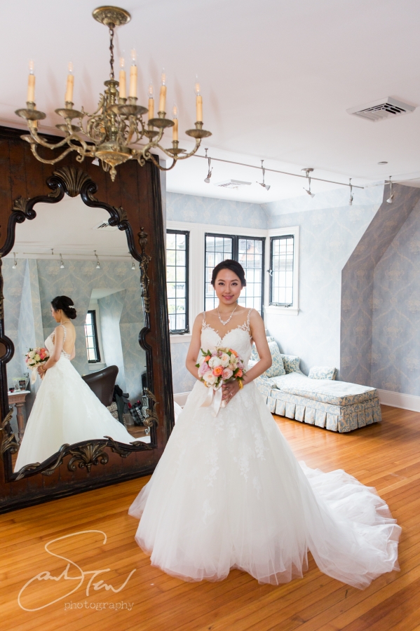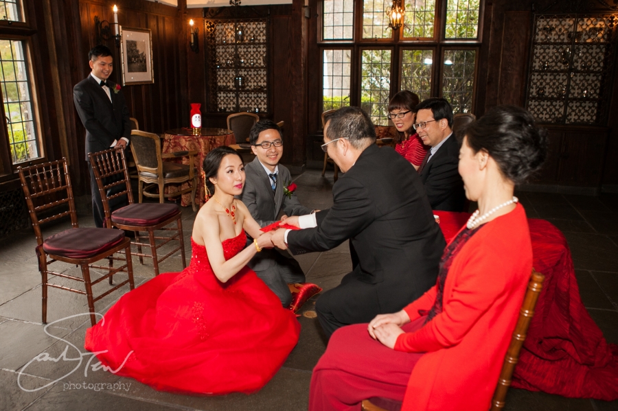 This intimate wedding was so sweet to capture– Stacy was tearing up before we even got to the sunlit greenhouse hallway where she was to have her first look with Wayne. When he turned around and came to embrace her she sobbed such sweet tears of joy and he wiped them away for her and held her sweetly. Nobody likes rain on their wedding day but I knew Stacy and Wayne were particularly enamored with the exteriors of the venue, so I kept peeking outside to see if the misty rain had cleared up yet. Luckily the venue itself was quite lovely and expansive– so even though we didn’t get much time with them outside I was able to get some portraits in the pretty natural light of the plant-filled greenhouse, as well as a handful of other portraits I knew they’d love at various spots in the beautiful spaces we found there. After capturing the couple alone together and then with their wedding party and family groups, Stacy went up to the bridal suite to change into a long red gown she had chosen to wear for a traditional tea ceremony with their parents. Wayne got a 2nd “first look” with this dress as she came down the stairs, and they exchanged meaningful blessings with their parents in the privacy of a small elegant room as they served them tea and gracefully received wedding gifts in the traditional red envelopes. Right after the tea ceremony I noticed that the rain was much lighter (though still lightly sprinkling)– I suggested we step outside with one of my white shooting umbrellas and the couple was game! We quickly made some pictures with them outdoors and then it was back upstairs to change back into the white wedding dress as guests began arriving for the main ceremony with Father Jack Ryan. Much of the ceremony was translated so that guests from abroad could follow the events, but I dont’t think you’d need to know english to feel the emotions that came through in their wonderful vows to one another. After an relaxing cocktail hour where family and friends reconnected, Stacy and Wayne and their guests were invited into an elegant dining room for dinner and dancing. Everyone was delighted by the Tango they had learned for their first dance, and we were treated to a series of toasts that celebrated the couple’s history, accomplishments, and love for one another. Stacy and Wayne capped off the evening by cutting their wedding cake and giving a speech of thanks to their family and friends who had come to support them as they made their commitment to marriage. These two are off to a wonderful start– congratulations to Stacy and Wayne!