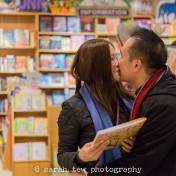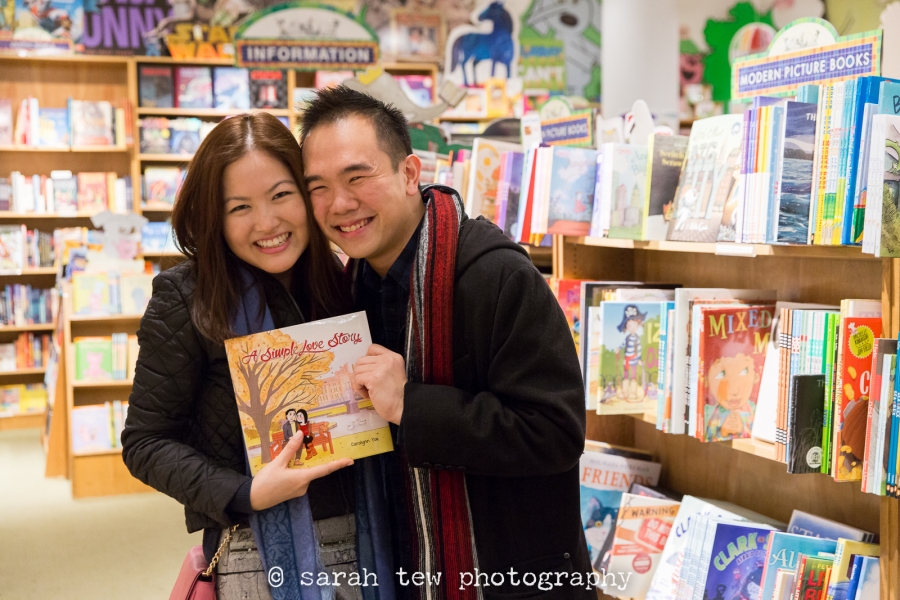 Kevin wrote to me with a wonderful proposal idea and wanted to see if I could shoot it in a way I wouldn’t be noticed to surprise his intended. He had had a storybook created with help from an illustrator– it looks amazing and tells the story of how he and his girlfriend had met, where they went on their initial dates, things that happened in their lives leading up to his proposal, and even had the illustrator draw them in the outfits they were wearing in these stories. He had me arrive early and place the book on a shelf we pre-planned for him to ‘find it’ at Books of Wonder, a fabulous independant children’s book store who’s proprietors were so gracious to let us do this… On the way to dinner reservations with her he made sure they had some extra time to kill and suggested they duck in and browse for a minute… his plan worked perfectly and she was so delighted by the book and his proposal at the end of it. I loved capturing this for them and was able to make a few sweet night portraits by some trees down the block that were lit up with Christmas lights. Congratulations!