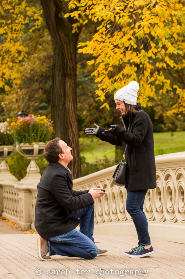 James contacted me looking for a proposal photographer as he was planning to ask his girlfriend to marry him and he knew it would be so special to have the moment captured. I met him in Central Park and we coordinated a plan for me to wait for him and Sarah, his intended, to walk up onto the beautiful and iconic Bow Bridge, where he would propose, on a friday morning, when there wouldn’t be too many people around. I arrived to find the glorious changing leaves and a nice empty bridge… what a lovely fall morning to get engaged! Sarah was, needless to say, happily surprised, and they let me take some portraits of them around the park before they made their way to a special breakfast reservation James had made to celebrate the occasion. Check out my favorites from this delightful shoot and get in touch if you or someone you know is in need of some surprise proposal photography!